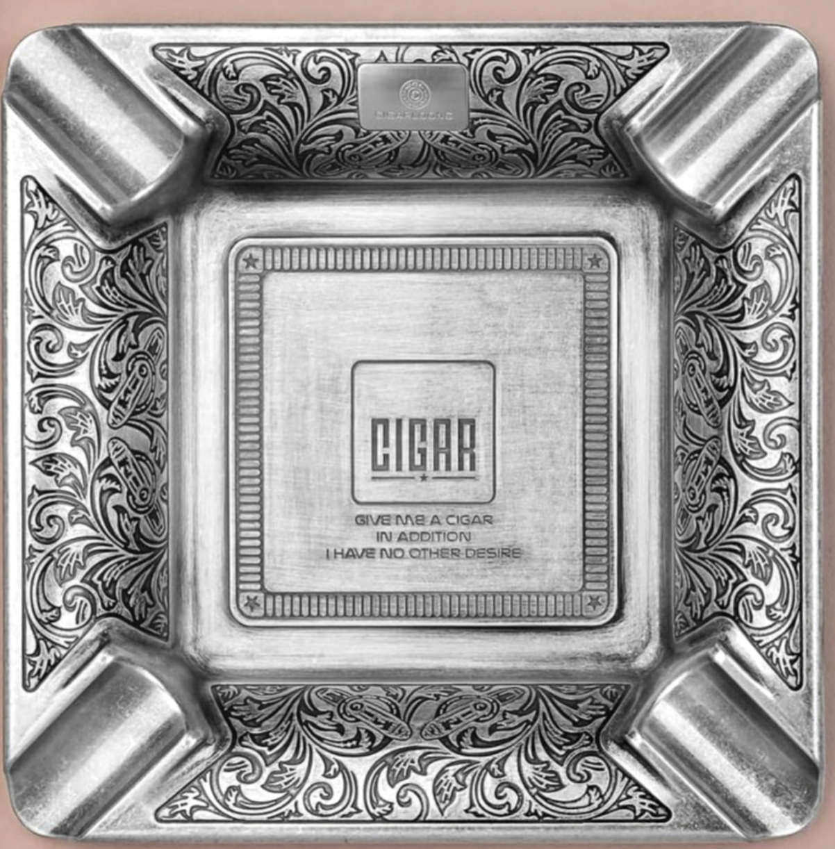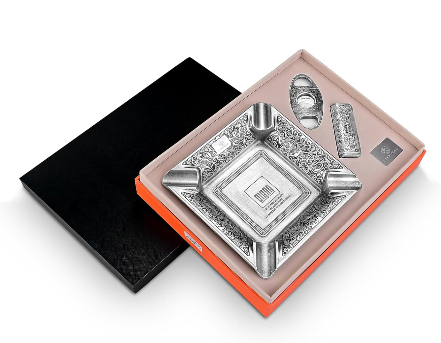 Set cadeau luxe signé CIGARLOONG. Coupe-cigares en acier, briquet torche rechargeable et cendrier sculpté 4 fentes. Gravures florales argentées, finitions élégantes et durables. Parfait comme cadeau pour gentleman amateur de cigares.